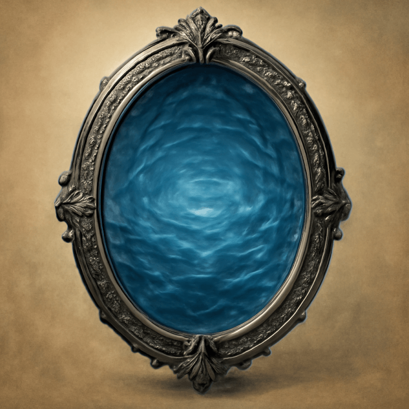 A weathered, silver-framed mirror etched with ghostly runes; its surface ripples like disturbed water, revealing more than just reflection.