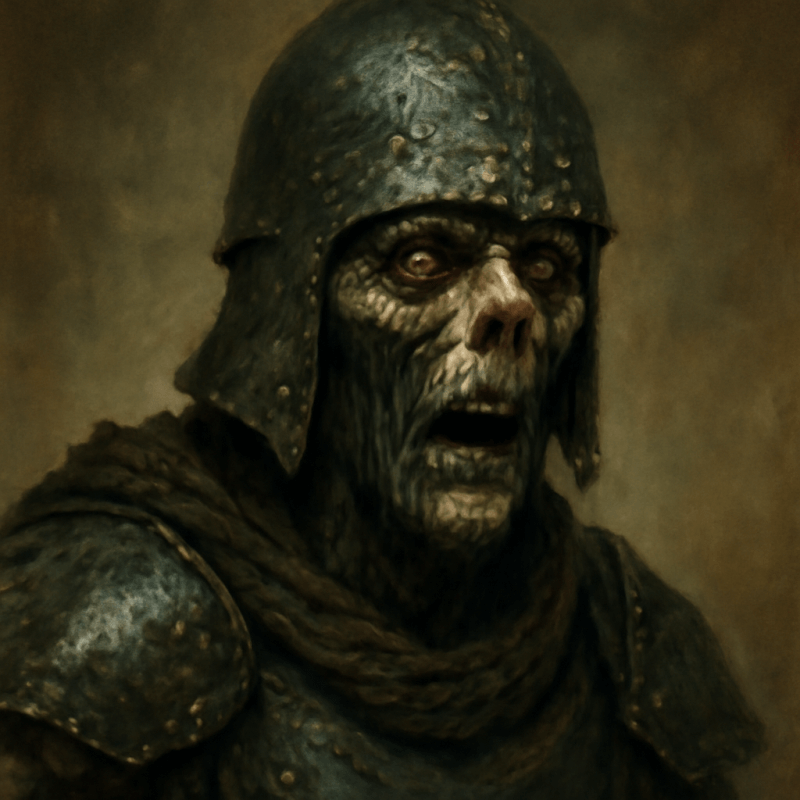 A gaunt, gasping face beneath a cracked iron helm, streaked with tar and rot.