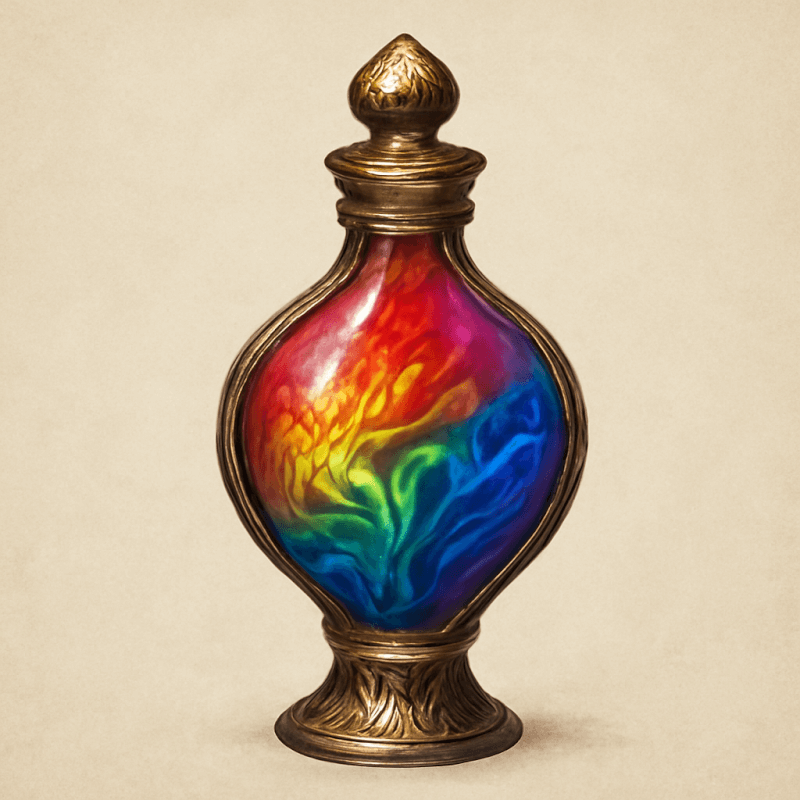 A small vial containing a liquid that changes color with the drinker's mood, revealing emotions in vivid hues and patterns—used for subtle psychological insights or manipulative displays.