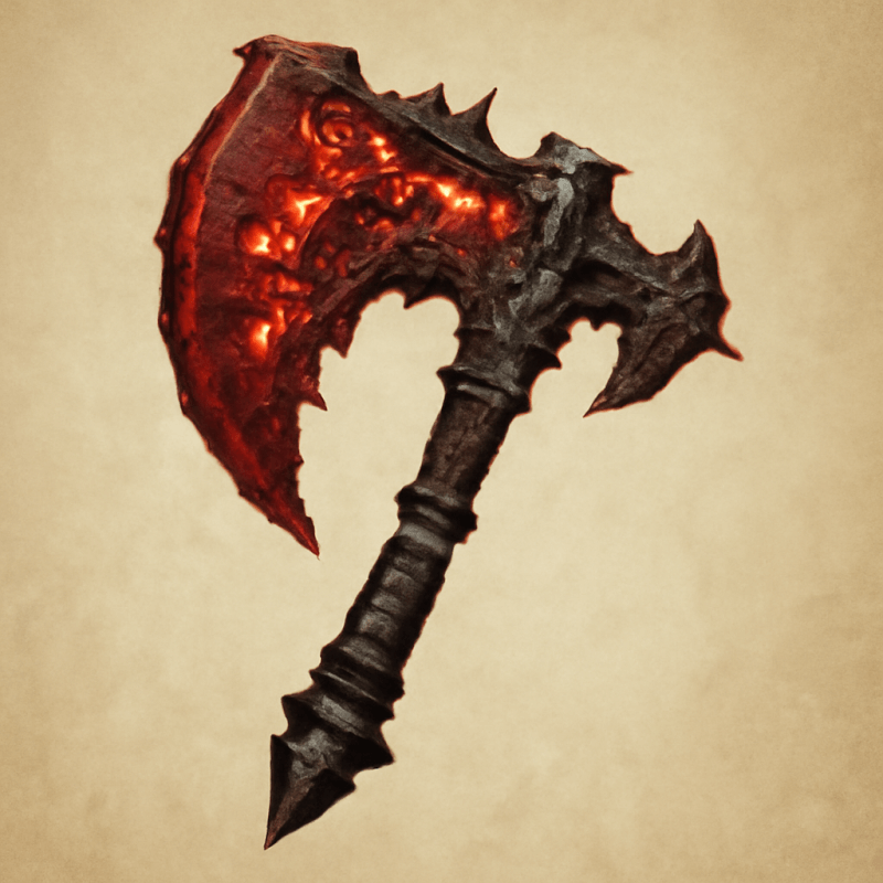 A jagged, crimson-stained axe with runes flickering across its blade, rumored to thirst for fresh blood.