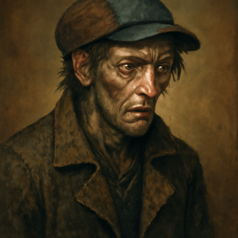 A gaunt figure with faded scars, smeared with grime, eyes darting nervously beneath a mismatched cap and patched coat.