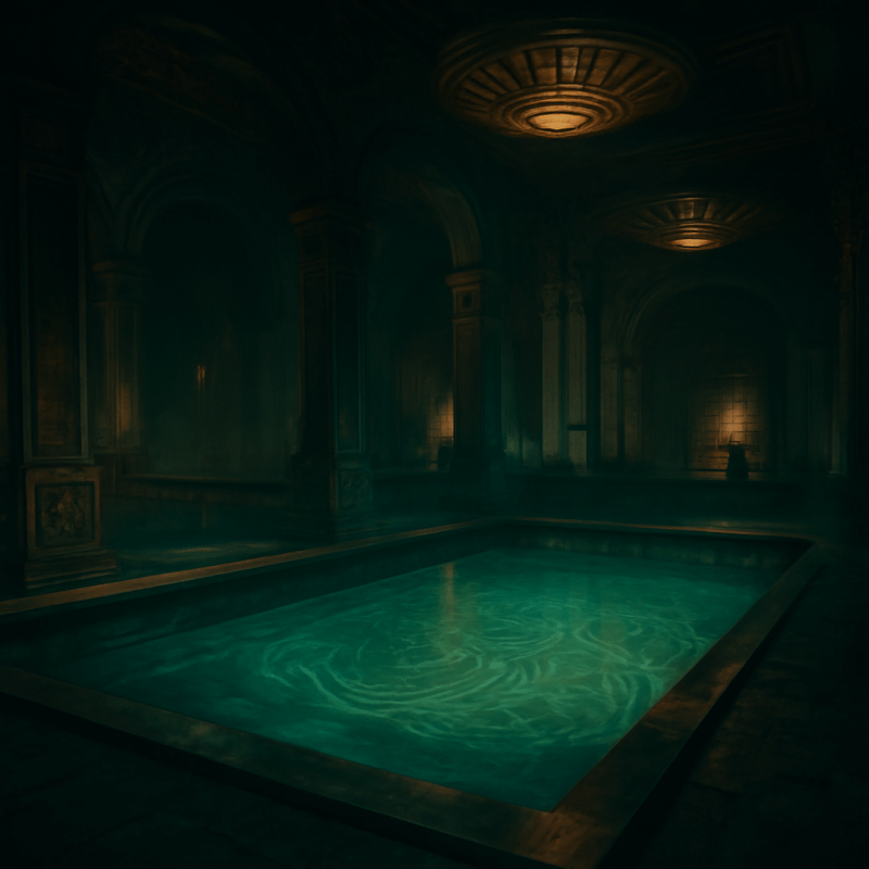 An opulent, art-deco styled bathhouse frequented by the city’s elite; beneath the marble pools, strange carvings pulse faintly with unnatural light, and shadows seem to cling longer than they should.