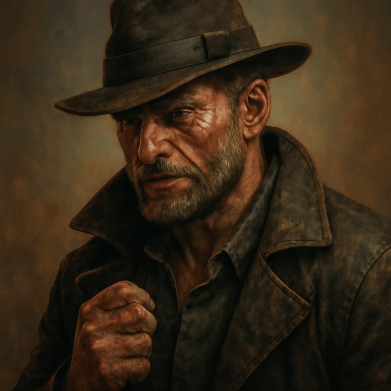A heavily scarred man with gritty, weathered features; limps slightly but moves with deliberate purpose, often cracking knuckles or adjusting a battered fedora.