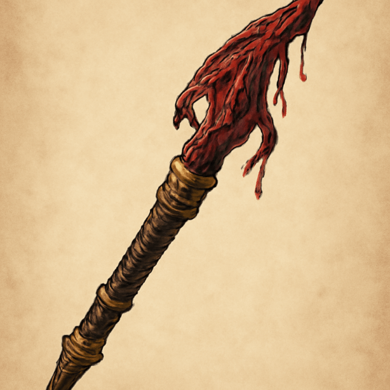 A gore-stained spear with a twisted, blood-dripping tip, foul-smelling and alive with malevolent intent.