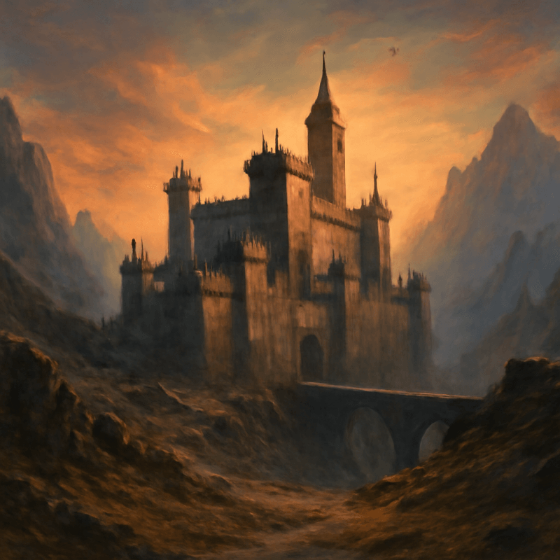 Towering dark walls loom over a barren, windswept plain; the air hums with an oppressive stillness, broken only by distant, echoing guards' calls.