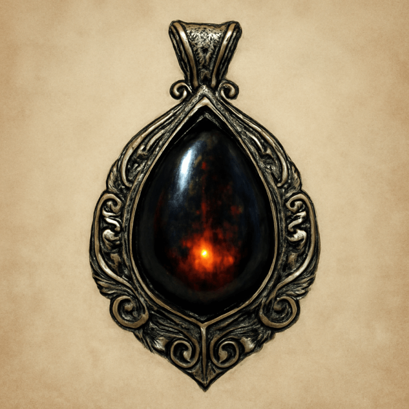 A dark, obsidian-like gem that pulses with a faint, sickly glow, embedded in a tarnished silver filigree, whispering promises of power and corruption.