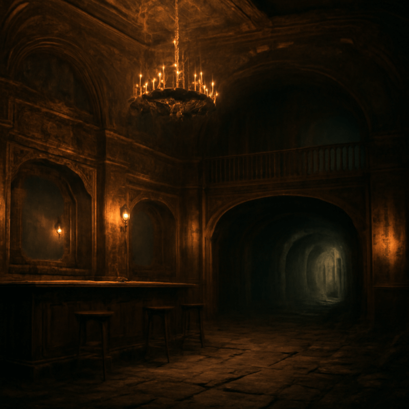 A once-elegant tavern painted in peeling gold leaf, its cellar hides a dark secret beneath rotting timbers and shadowed corridors.