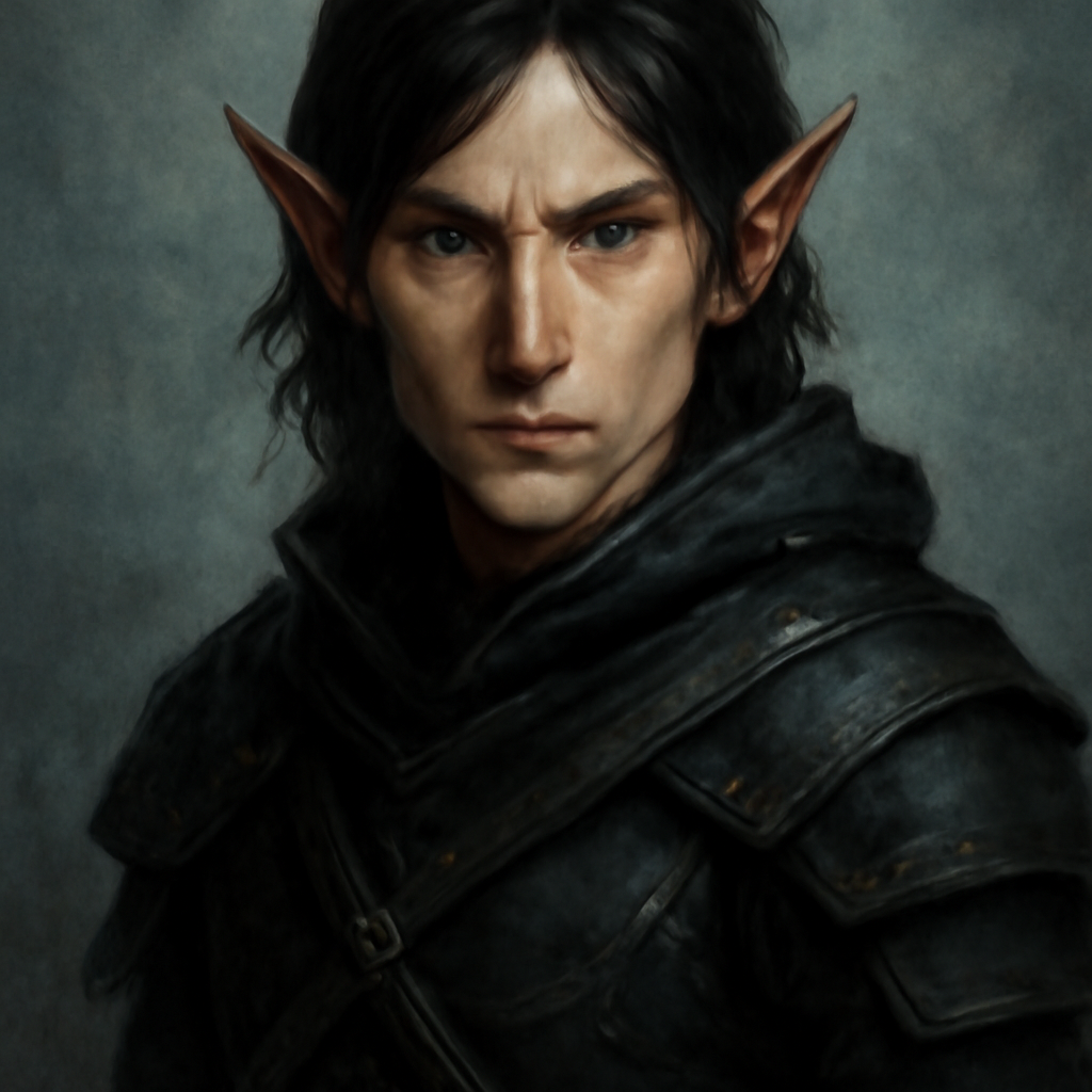 A lean elf roguish scout with piercing eyes and quick, graceful movements, wearing shadow-dark leather armor.