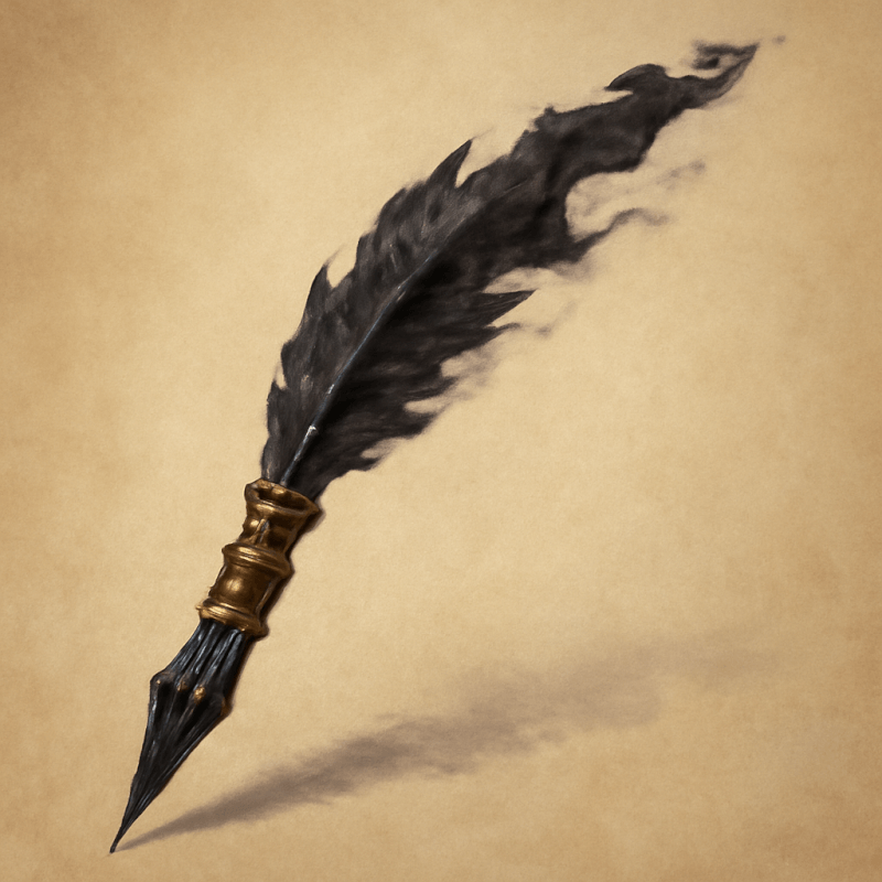 A jagged, obsidian quill with a flickering, shadowy ink that seems to bleed across its tip, unsettling to behold.