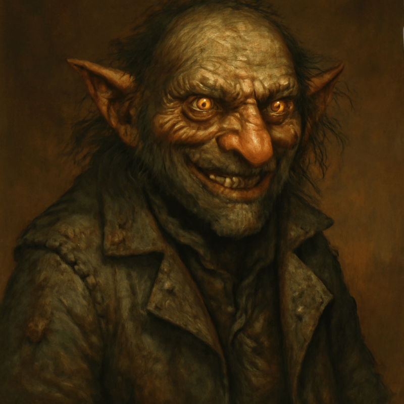 Gnarled, oily-faced trader with eyes that gleam like cracked glass. Wears a smudged, patchy coat and a crooked grin.