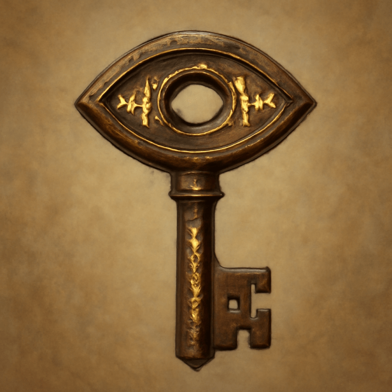 A tarnished, rusted brass key with an eye-shaped hole at its bow, etched with undecipherable glyphs that shift when not observed.