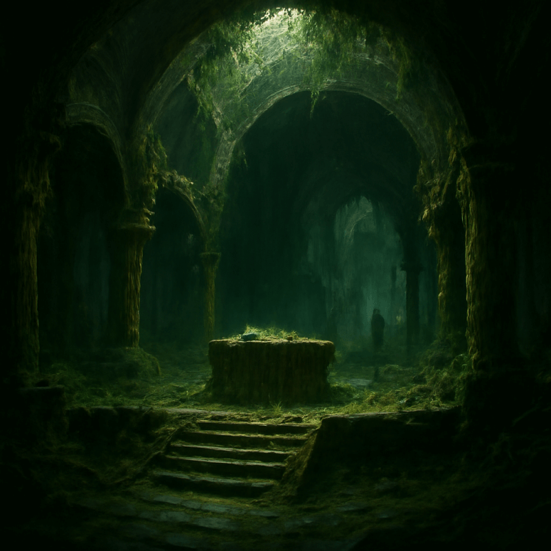 An ancient, long-abandoned temple overtaken by creeping vines and moss, its once-sacred halls twisted into a shelter for shadows and secrets.
