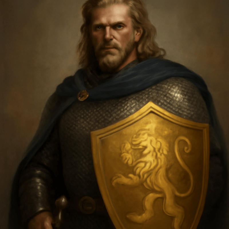 A towering figure clad in gleaming chainmail, with a radiant shield emblazoned with a lion's crest, exuding an aura of unwavering resolve.