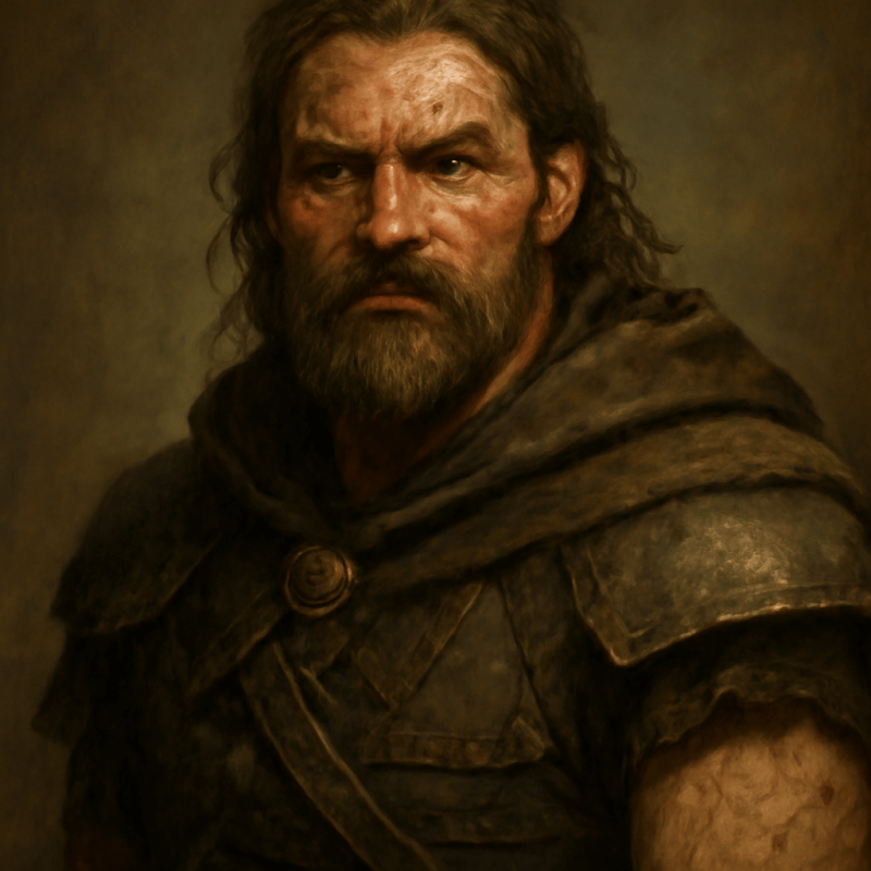 A rugged figure with a weathered face, piercing eyes, and a body scarred from years of conflict, exuding quiet authority and preparedness.