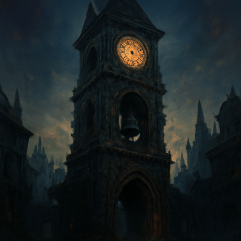 Clad in weathered stone and twisting vines, The Midnight Chime's unsettling hours ripple across the city, its bell tolls echoing at odd intervals, stirring fears and memories from forgotten times.