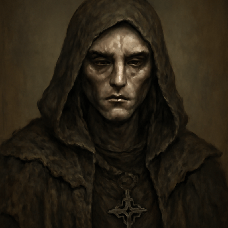 A gaunt, scarred figure draped in tattered cloaks, eyes hollow yet piercing, bearing the weight of countless losses.