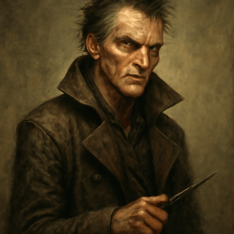 Scarred, wiry, with eyes sharp enough to cut through lies. Wears a battered duster, clutching a concealed stiletto.