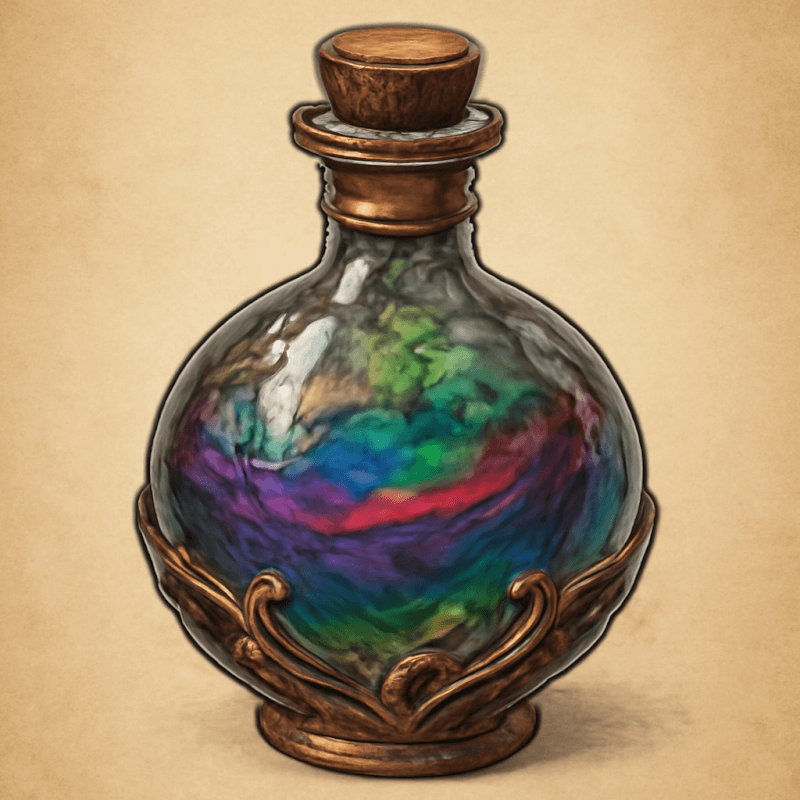 A cracked glass vial filled with a swirling, oily liquid that constantly shifts hue, reflecting its holder's mental state.