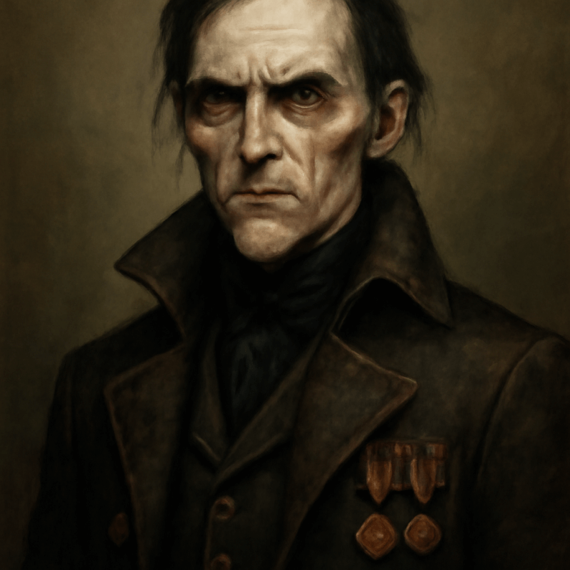 Gaunt, with pallid skin, dark eyes, and a jagged scar across his jaw; wears a tarnished aristocrat's coat and a few fading medals.