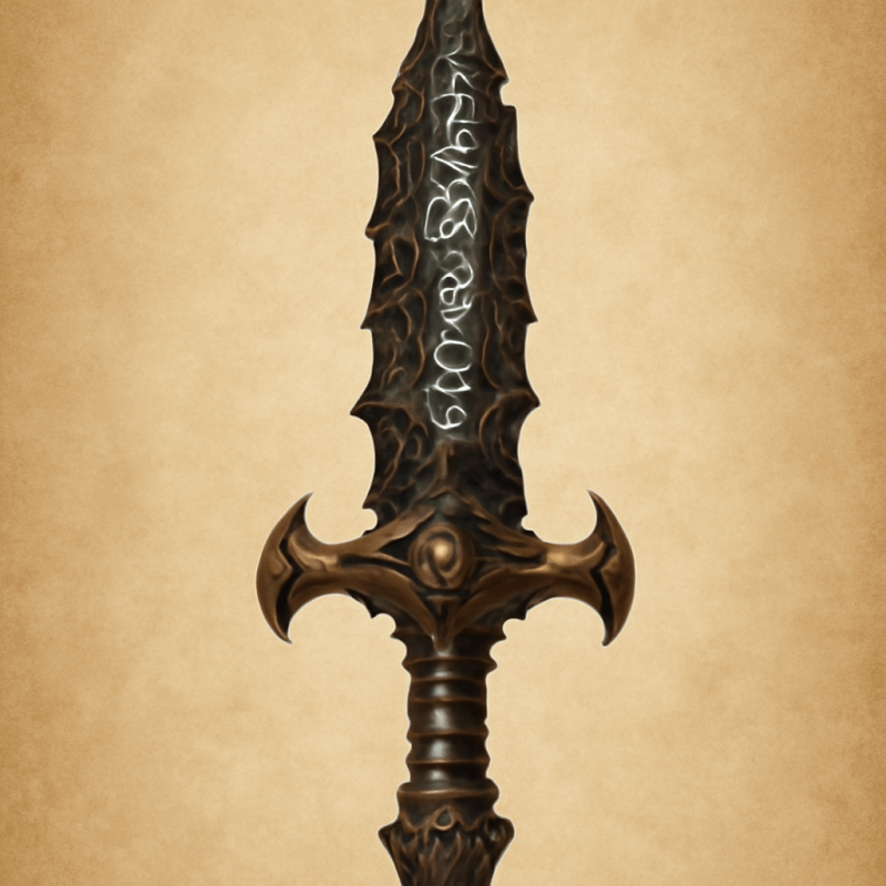 A darkened bronze dagger with jagged, obsidian-like edges; its blade is etched with unknowable symbols that seem to shimmer in low light, exuding a faint, otherworldly hum.