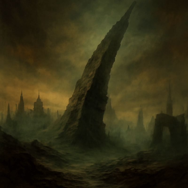 Once a towering sentinel over the city, the spire now leans precariously, its stones fractured and cloaked in an unnatural haze, harboring silent, malevolent forces.