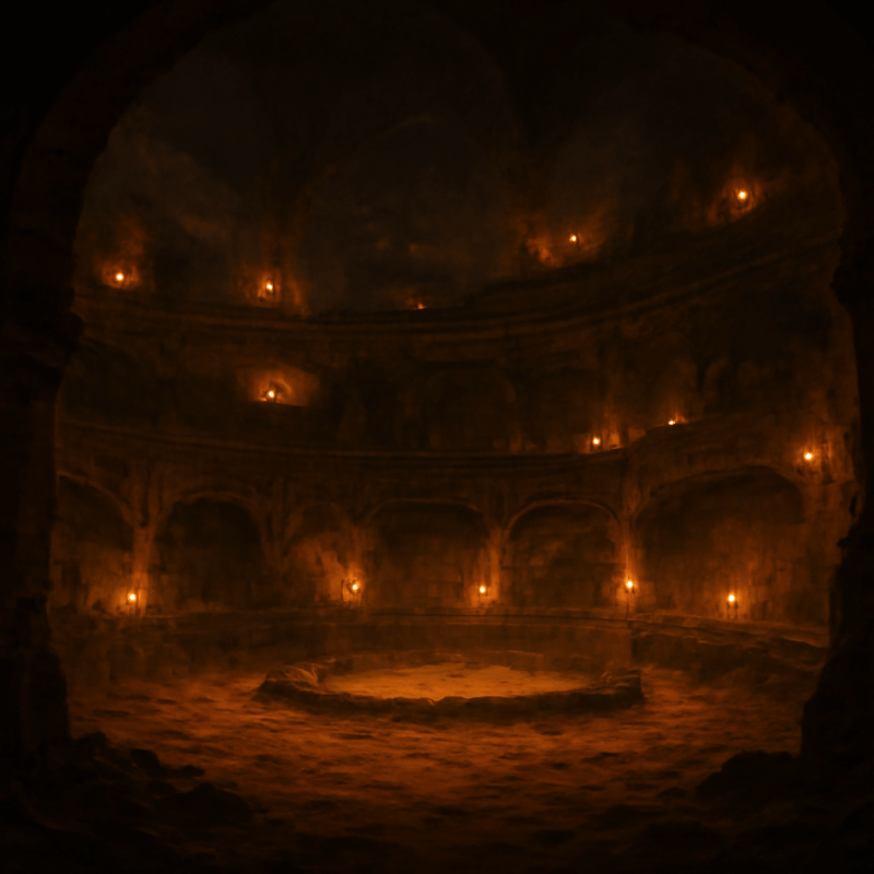 A tumultuous underground coliseum lit by flickering lights and scorched by the roar of the crowd, where combatants clash in brutal, no-holds-barred bouts.