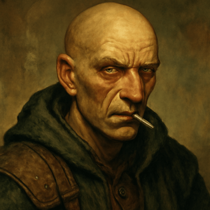 Bald, jaundiced face, eyes darting like rats. Slumped posture, cigarette permanently clenched.