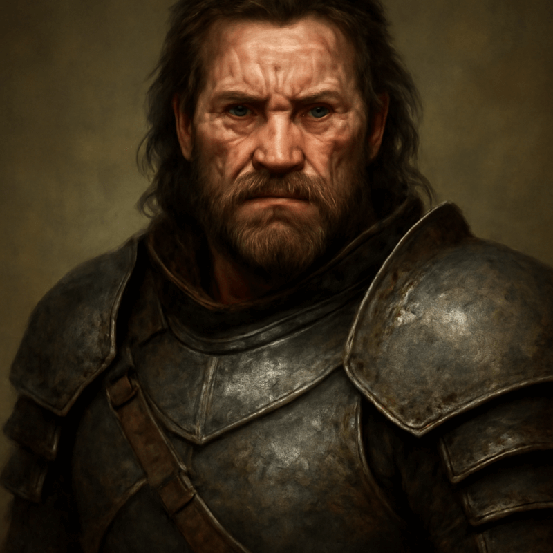 A scarred, imposing figure clad in battered armor, radiating unwavering resolve and fierce compassion
