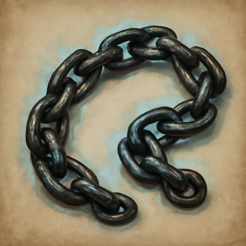 A tarnished iron chain with ghostly runes flickering faintly along its links, vibrating subtly as if haunted by unseen ties.