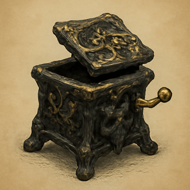A tarnished music box carved from blackened bone, its gilded surface cracked and whispering with unknown forces. It plays haunting, unsettling melodies that seep into the mind's shadows.
