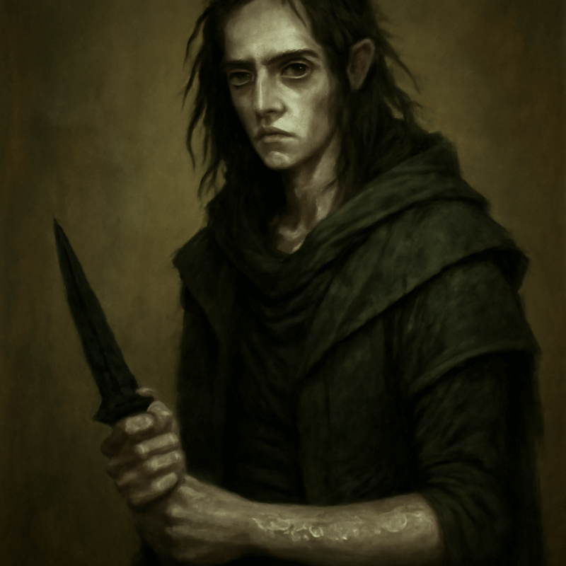 A lithe figure with pale skin, vacant dark eyes, and a faint glow of faded runes etched across forearms; carries a shadowy dagger.