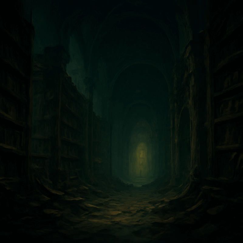 A crumbling maze of shadowed stacks, where forbidden tomes whisper eldritch secrets, and unseen eyes watch from the darkness.