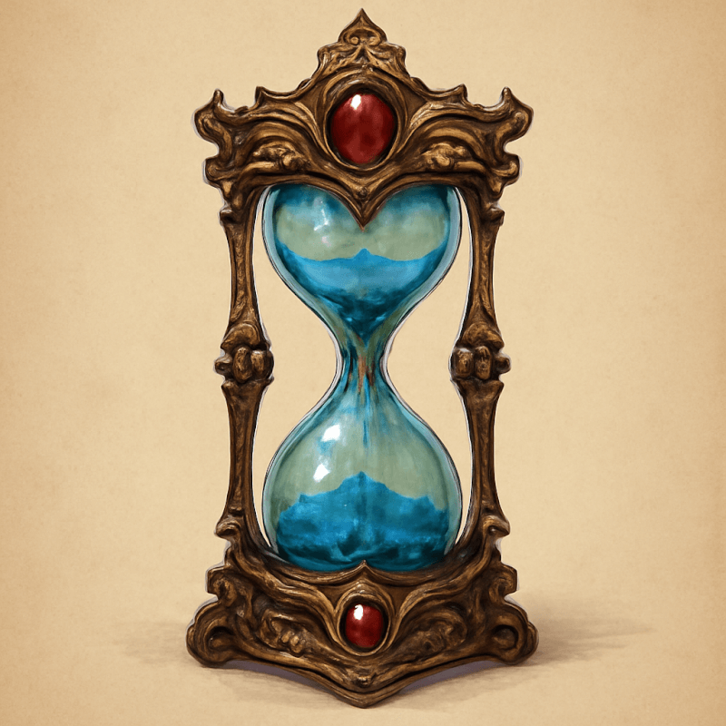 An intricately crafted hourglass that measures the passage of pivotal events rather than seconds, revealing shifts in fate and history with each turn.