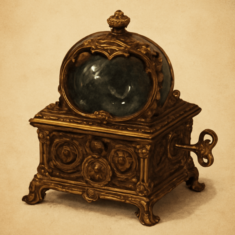 An ornate brass music box encrusted with tarnished gears and dark, cracked glass, emitting a faint oily glow; it plays melodies that unsettle the soul and linger like a ghost.