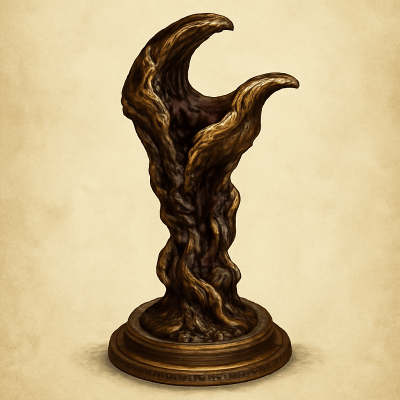 A twisted, gnarled brass device resembling a cracked larynx, veins pulsating with dark liquid—eerily alive to the touch.