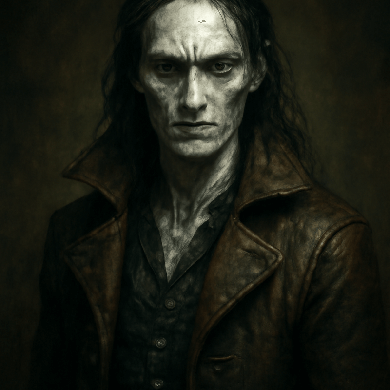A gaunt, pallid figure with silver-threaded tattoos and cold, calculating eyes; wears a battered leather coat and always seems to hover just at the edge of shadow.