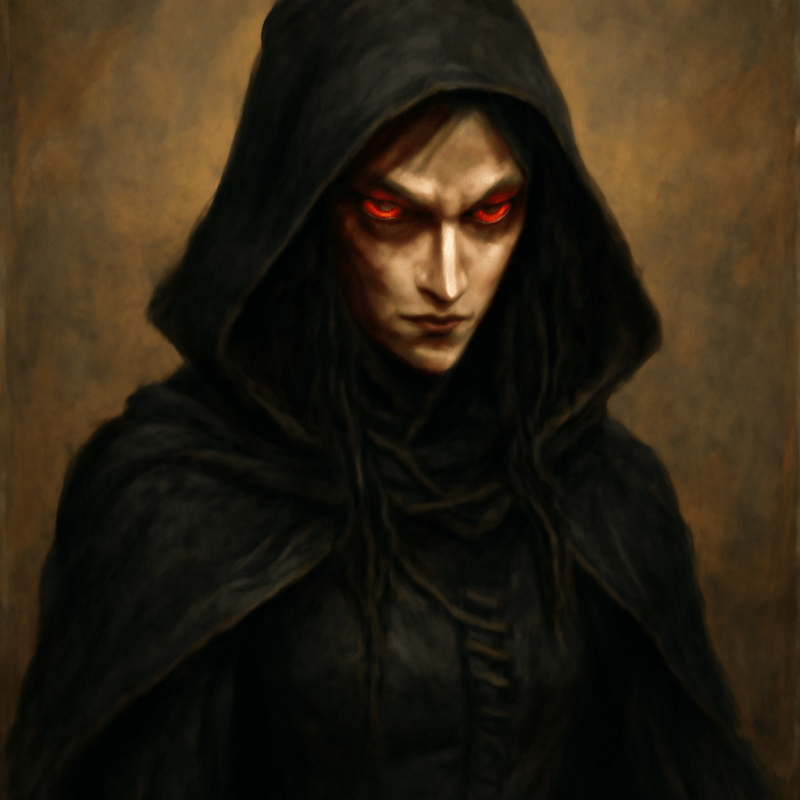 A slender figure cloaked in dark, flowing robes with glowing crimson eyes, eyes burning with vengeful intent.