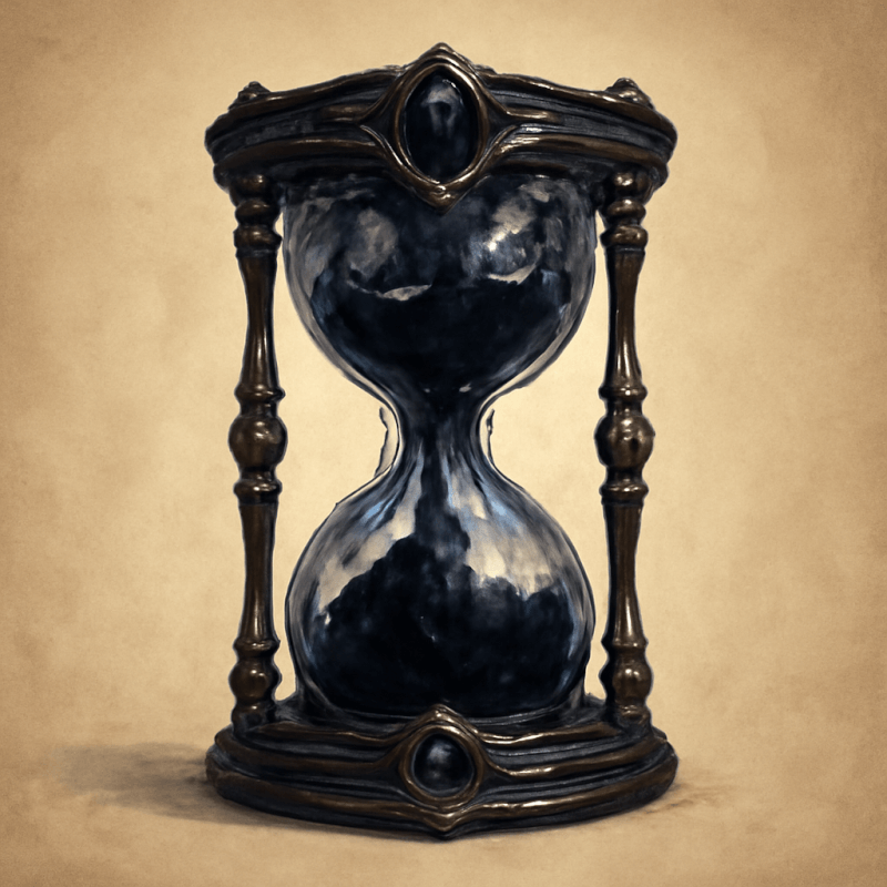 A shattered, blackened glass hourglass with void-like sand that never shifts, its shape flickering between corporeal and spectral. It measures not minutes nor seconds but the decay of hope and the expansion of despair within a vampire’s soul.
