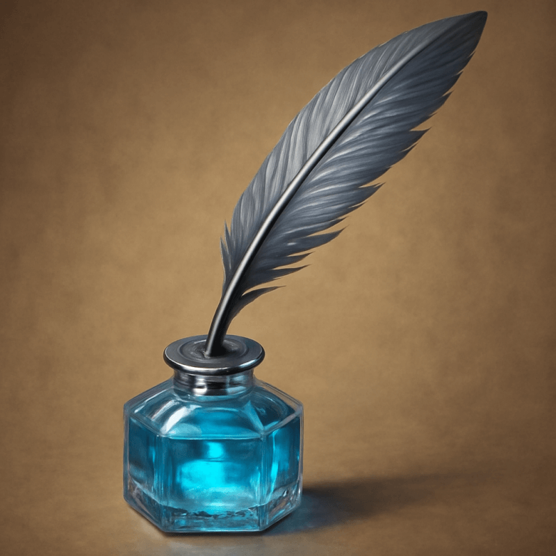 A sleek, silver quill with a shimmering inkpot carved from clear crystal; it feels eerily warm to the touch.