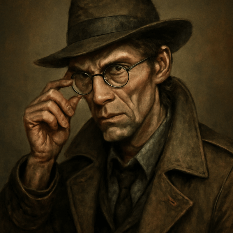 A gaunt, steely-eyed man with a weathered face, always with a battered fedora and a worn trench coat, habitually nervously adjusting his glasses.