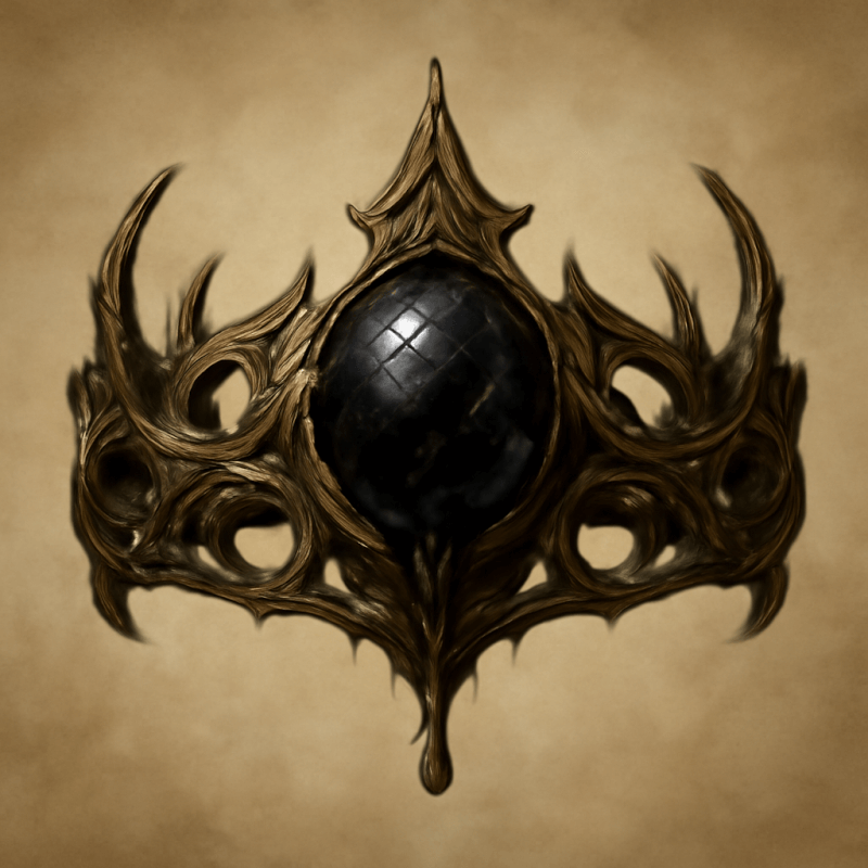 A tarnished crown of twisted brass, crowned with a cracked, blackened jewel that oozes a foul, oily substance.