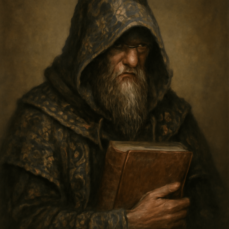 A gaunt, bearded scholar with veiled eyes; cloaked in worn robes covered with arcane glyphs, clutching a leather-bound tome.